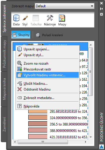 Ve Správci zobrazení vytvoříte vrstevnice kliknutím pravým tlačítkem na hladinu povrchu.