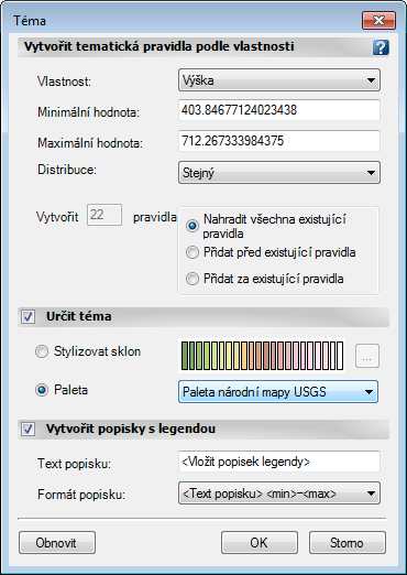 - V dialogu Téma pod položkou Určit téma klikněte na možnost Paleta a vyberte položku Paleta národní mapy USGS.