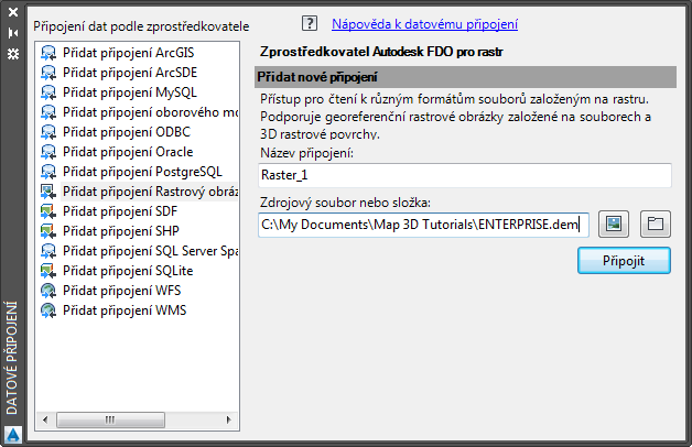 - V dialogu Datové připojení pod položkou Připojení dat podle zprostředkovatele klikněte na tlačítko Přidat připojení rastrový obrázek nebo povrch a klikněte