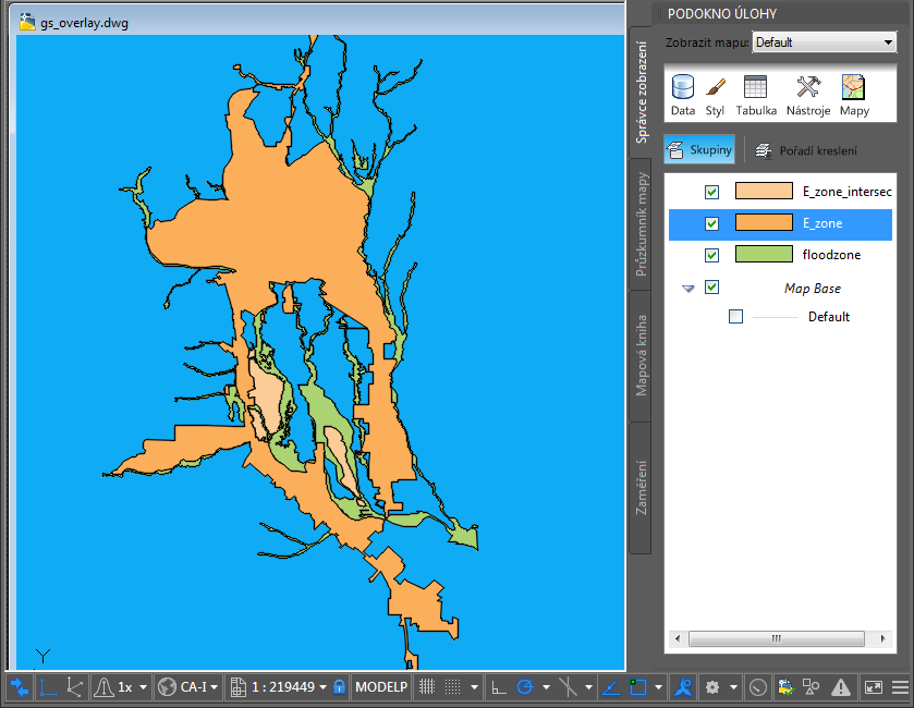 Tato mapa překrývá dvě hladiny (záplavovou zónu a obchodní zónu). Pomocí překrytí zobrazíte, kde se protínají. Tato plocha se stane novou hladinou, kterou je možné stylizovat, uložit do souboru a použít jako samostatné úložiště dat.
