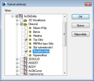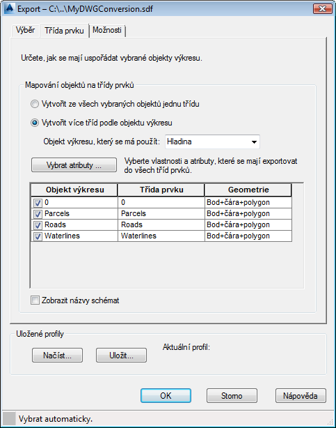 Atributy, které zde určíte, se přiřadí do všech tříd prvků v souboru SDF. Proto vyberte pouze atributy, které jsou vhodné pro všechny třídy. Lze například vybrat obecné vlastnosti, které obsahují například tloušťku čáry apod., ale ne vlastnosti objektových dat, které jsou určené pro každou třídu prvku.