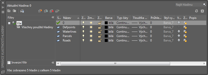 Zobrazí se hladiny ve výkresu a jejich vlastnosti.