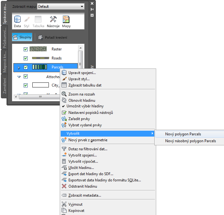 Každá položka v aplikaci AutoCAD Map 3D má uživatelskou nabídku, která obsahuje příkazy dostupné pro danou položku v daném okamžiku.
