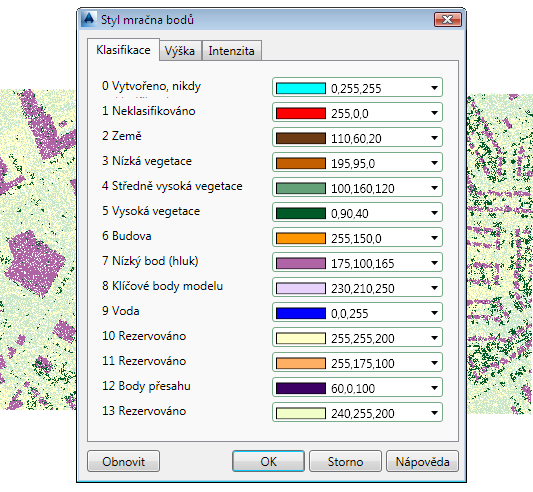 lze nastavit podle klasifikace, výšky, hustoty dat systému LiDAR a hodnot RGB.