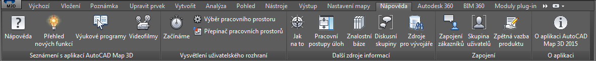 - Nápověda: Procházejte nebo prohledávejte koncepty a postupy, které pokrývají veškeré aspekty aplikace AutoCAD Map 3D.