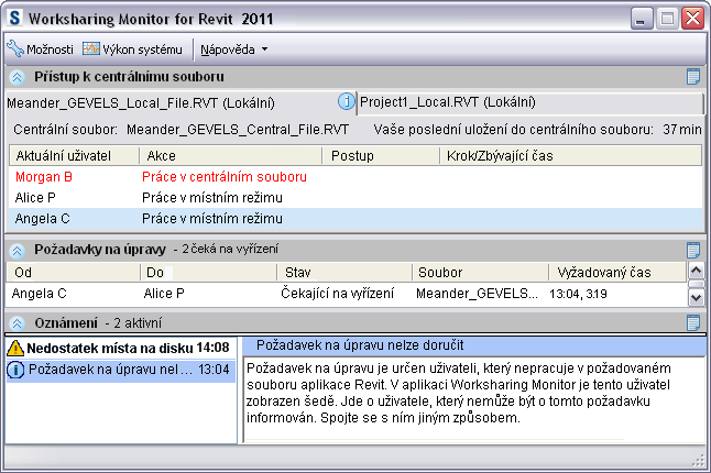 Poznámka: Když je okno aplikace Worksharing Monitor aktivní, upozornění na ploše se nezobrazují, protože stejné informace obsahuje dané okno aplikace.