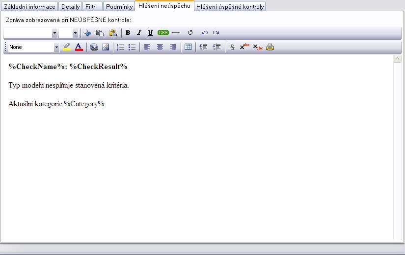 V horní části se nachází standardní Editor WYSIWYG HTML. Pod ním je v hlavní části okna místo k zadání textu, obrázků, odkazů, tabulek a podrobností, které uživatelům pomáhají zjistit, proč mohla být daná kontrola neúspěšná. Části se symbolem % představují „dynamický text“. Při použití budou nahrazeny skutečnými hodnotami kontrol v Prohlížeči výsledků. Dynamický text lze přidat klepnutím pravým tlačítkem v hlavní části okna a výběrem rozevírací nabídky Vložit: