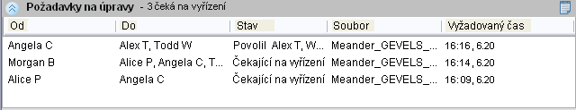 Když je požadavek povolen, zamítnut nebo odvolán, přesunou se příslušné informace do Historie požadavků na úpravy. Je-li požadavek odeslán více uživatelům, zůstává zobrazen v podokně Požadavky na úpravy, dokud nebude plně povolen (nezamítne jej žádný z příjemců).