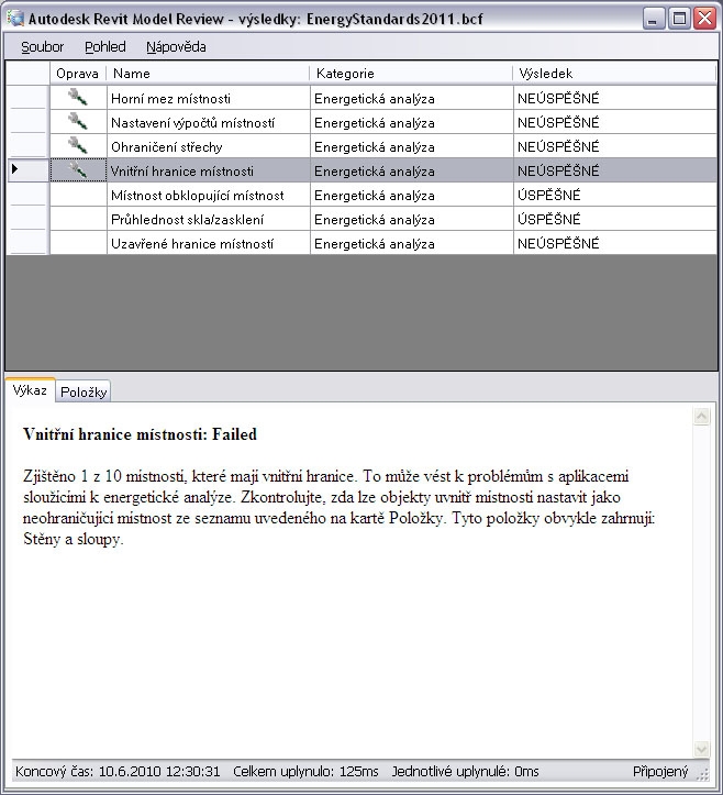 Na kartě Položky jsou uvedeny konkrétnější údaje o výsledcích kontrol. Umožňuje vybrat ze seznamu požadovanou položku a pomocí aplikace Revit vyhledat nejvhodnější pohled pro nastavení či úpravy v případě, že je dostupný zdroj problémů a je možné provést revizi nebo ruční opravu.