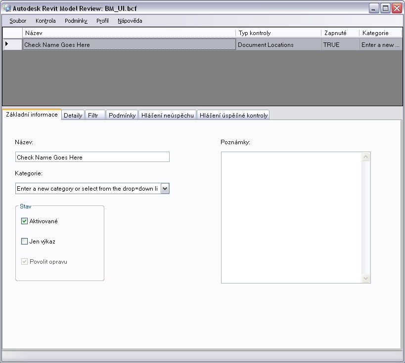 Při prvním otevření části Správa Autodesk Revit Model Review je třeba vytvořit a konfigurovat kontroly.