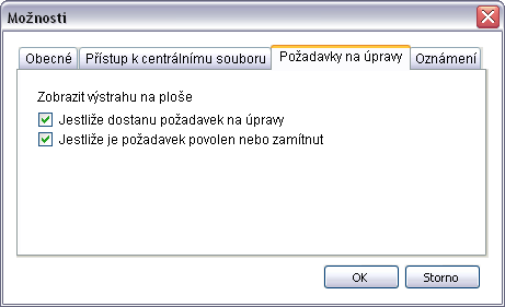 Výběrem příslušné možnosti potvrďte, že si přejete, aby se na ploše zobrazovaly výstrahy, když vám někdo zašle požadavek na úpravy nebo když je některý z vašich požadavků na úpravy povolen či zamítnut. Chcete-li zabránit zobrazování těchto výstrah na ploše, zrušte výběr příslušné možnosti.