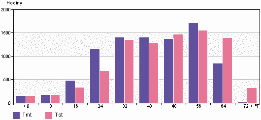 Při prohlížení souboru energetické analýzy v dialogu Výsledky a porovnání tento graf zobrazuje počet hodin za rok, po které teplota suchého a mokrého teploměru spadá do určitého rozsahu teplot.