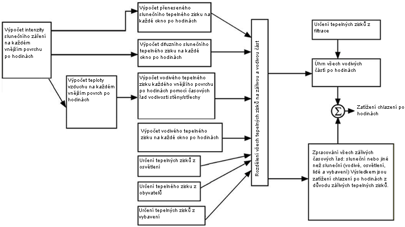 Většina tepelných zdrojů přenáší energii do místnosti spojením konvekce a záření. Konvekční část tepelného zisku se okamžitě stává chladicím zatížením. Vyzařovaná část musí být nejprve pohlcena povrchy a objemy povrchů vnitřních místností a chladicím zatížením se stává, pouze když je později přenesena konvekcí z těchto povrchů do vzduchu v místnosti. Proto se tepelné zisky zářením stávají chladicím zatížením za delší časové období.
