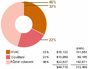 Pro každou oblast použití graf znázorňuje procentuální podíl celkové spotřeby energie, nákladů a kilowatthodin. Rozpoznáním, která oblast použití vyžaduje nejvíce elektrické energie, se můžete zaměřit na strategie k omezení celkové spotřeby energie tohoto projektu.