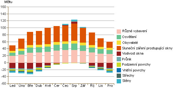 Příklad: Ve výše uvedeném vzorovém grafu dochází k největší kumulativní zátěži chlazení v srpnu a to největším příspěvkem hodnoty Osvícení oken slunečním zářením nebo tepelným ziskem slunečního záření okny. Podle porovnání jsou však tepelné zisky stěnami malé. Proto byste měli zlepšit sklo snížením solárního faktoru (SHGC) oken předtím, než budete investovat do vylepšení hodnoty izolace stěny.