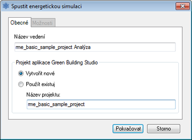 Pojmenujte spuštěnou simulaci a určete položku Projekt aplikace Green Building Studio.
