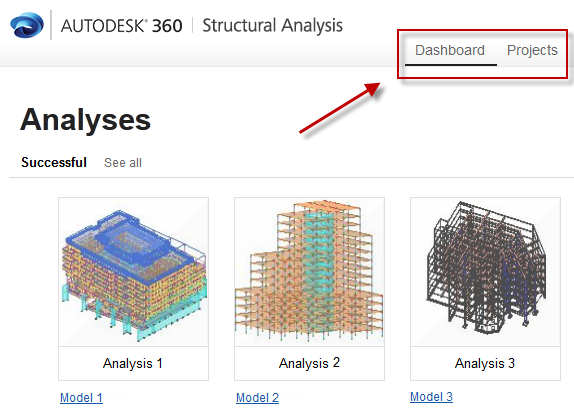 The Autodesk® 360 Structural Analysis website opens by default on the Dashboard tab. Here you can view the recently performed analyses (Successful, In Progress and Failed).