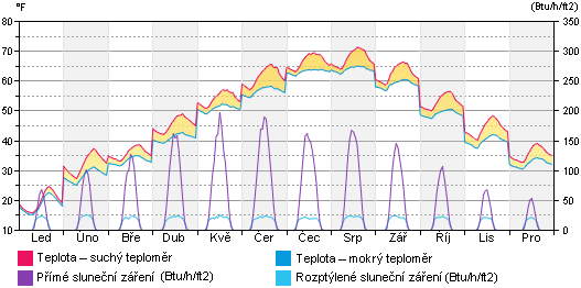 Osa y na levé straně je teplota a osy y na pravé straně je sluneční záření v BTU za hodinu na plochu.