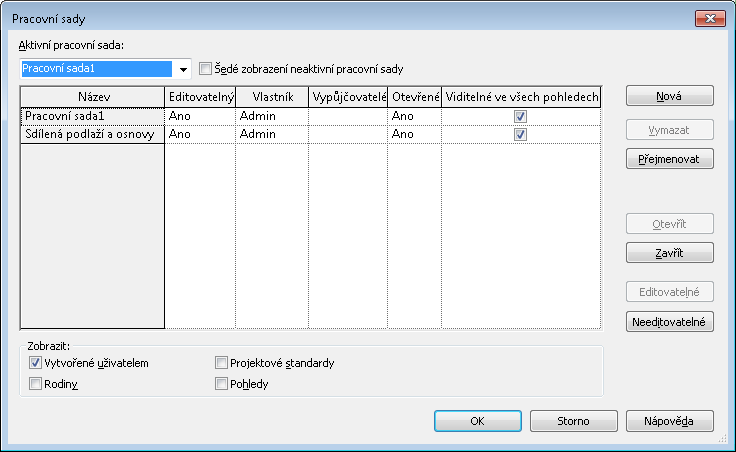 Na následujícím obrázku je ukázáno dialog Pracovní sady se dvěma výchozími uživatelsky definovanými pracovními sadami, což jsou Sdílená podlaží a osnovy a Pracovní Sada 1.