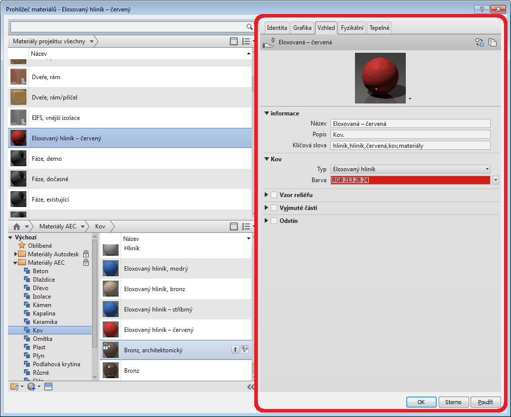 V Prohlížeči materiálů se tyto informace zobrazí na kartách Identita, Grafika a Vzhled na panelu Editor materiálů.