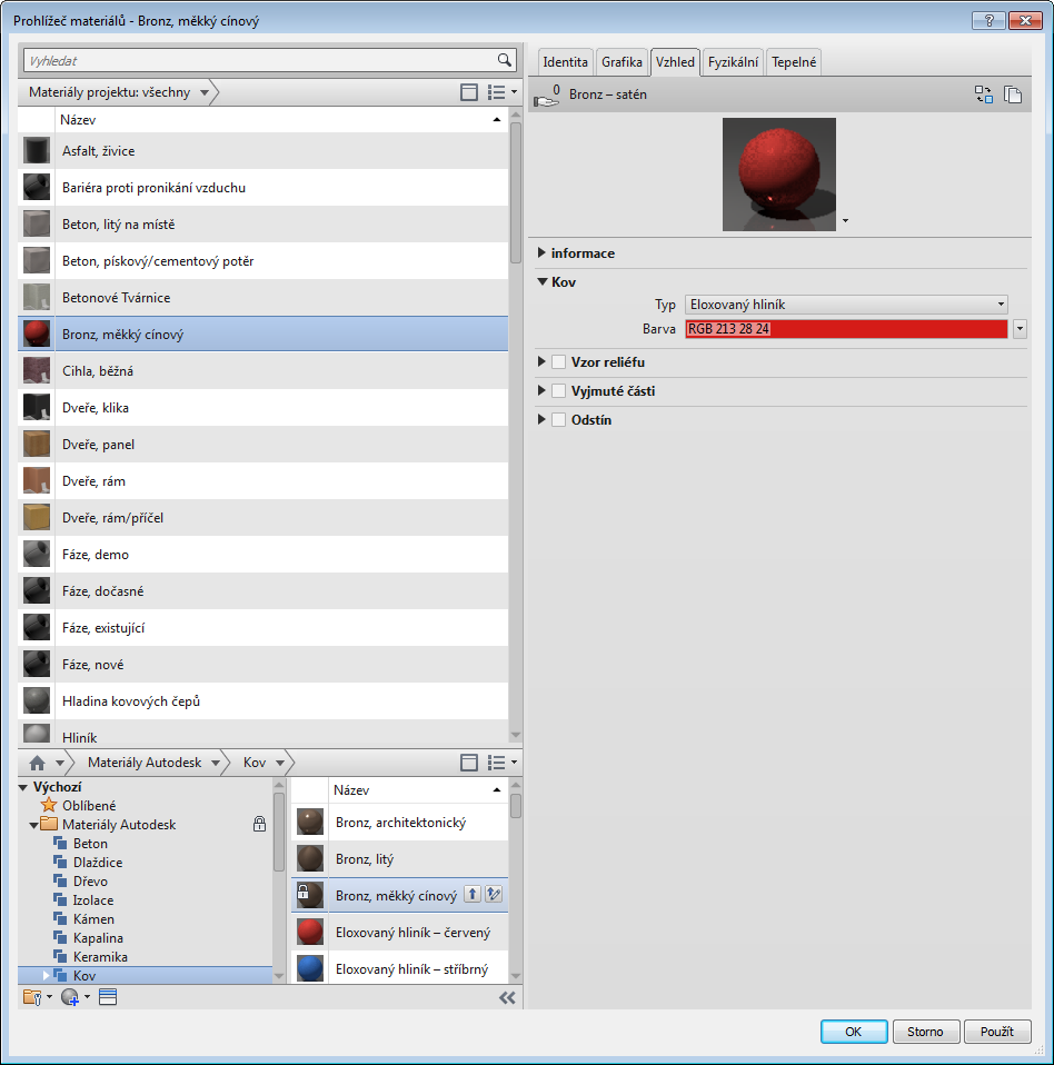Dialog Prohlížeč materiálů použijte k vyhledání a správě materiálů pro prvky.