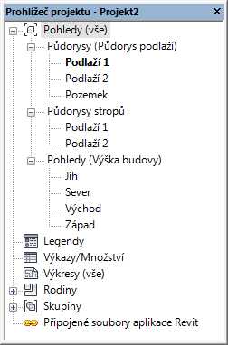 Prohlížeč projektu zobrazuje logickou hierarchii všech pohledů, výkazů, výkresů, rodin, skupin a dalších částí aktuálního projektu. Postupně jak rozbalujete a sbalujete jednotlivé větve zobrazují se položky nižší úrovně.