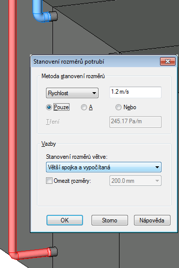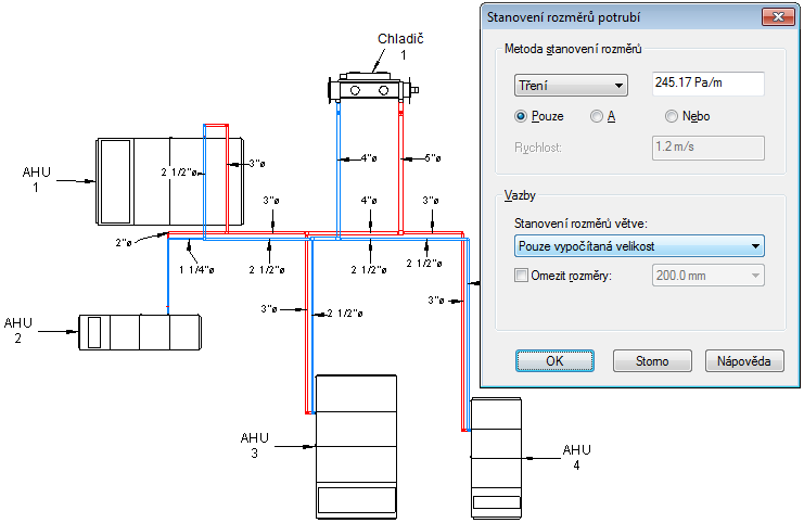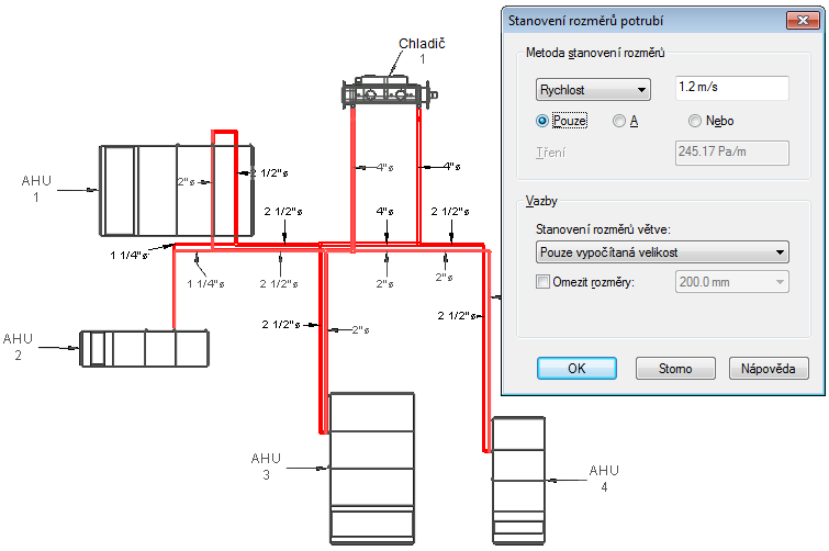 Následující obrázky znázorňují výsledky různých metod dimenzování teplovodního potrubí.