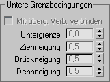 - Legt den Falloff-Effekt für die untere Begrenzung dieser Sehnenparameter fest. Der Wert 0,0 hat keinerlei Auswirkung. Beim Erhöhen des Werts wird der Effekt von "Ziehen", "Drücken" oder "Dehnen" zur übergeordneten Verbindung hin verschoben. Vorgabe = 0,5.