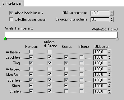 Auf der Registerkarte "Einstellungen" können Sie steuern, ob bestimmte Teile des Linsenblendeffekts, wie Strahlen oder Sterne, gerendert werden, indem Sie sie aktivieren oder deaktivieren. Sie können auch die axiale Transparenz des Linsenblendeffekts einstellen.