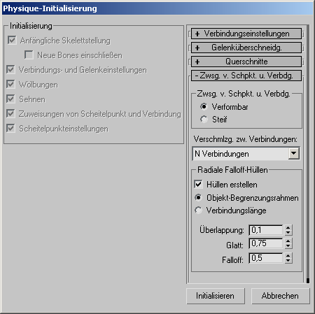 Die Kontrollkästchen im Bereich Initialisierung sind normalerweise nicht verfügbar und können während der Initialisierung nicht geändert werden. Obwohl diese Optionen nicht verfügbar sind, werden sie vorgabemäßig bei der Initialisierung aktiviert (mit Ausnahme von "Neue Bones einschließen"), da alle diese Einstellungen bei der erstmaligen Verwendung von "An Knoten befestigen" neu sind.