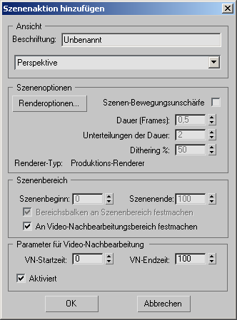 Klicken Sie auf Szenenaktion hinzufügen, und stellen Sie die Ansicht auf "Perspektive" oder auf eine "Kamera" in der Szene ein. Klicken Sie auf "OK", um das Dialogfeld "Szenenaktion hinzufügen" zu schließen.