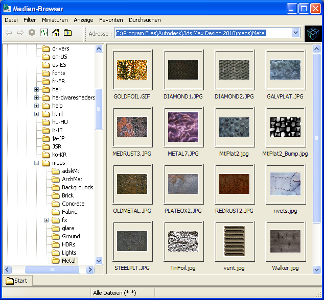 Diese Beispiele und Modelle können Sie in Ihre Szene ziehen, um sie direkt anzuzeigen oder zu präsentieren. mithilfe der Strg-Taste können Sie Geometrien an vordefinierte Stellen ziehen. Sie können mit dem Medien-Browser auch Miniaturdarstellungen von Bitmap-Texturen und Geometrie-Dateien auf Ihrer Festplatte oder auf gemeinsam genutzten Netzlaufwerken durchsuchen. Diese können Sie dann anzeigen oder in Ihre Szene bzw. auf gültige Map-Schaltflächen oder Musterfelder ziehen.