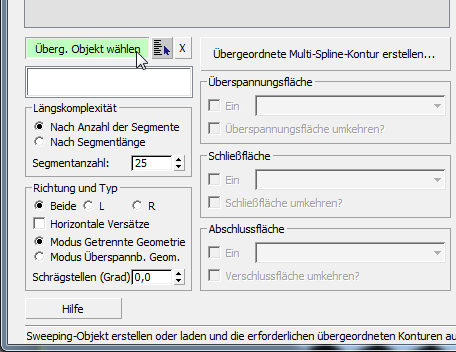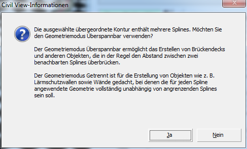 Dieses Dialogfeld wird angezeigt, weil das Konturobjekt mehr als einen Spline enthält. In diesem Fall kann der Sweeping-Objekt-Stil-Editor den Zweck jedes Splines auf eine von zwei Arten interpretieren. Um Objekte wie Brückendecks und Tunnelauskleidungen zu erstellen, ist der "Modus Überspannb. Geom." wünschenswert: Dieser Modus geht davon aus, dass jeder Spline eine Seite der Straße darstellt, und das Überspannen und Schließen von Flächen kann "Verbindungsflächen" erstellen, die die Lücken zwischen den Splines schließen können. Die Alternative, "Modus Getrennte Geometrie", ist für die Konstruktion von Lärmschutzwänden und Rückhaltewänden besser geeignet: Für diese Arten von Objekten wird die Geometrie der Sweeping-Objekte einzeln auf jeden Spline in der Kontur angewendet.