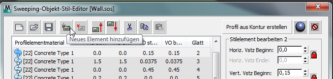 (Neues Element hinzufügen). Nachdem Sie auf diese Schaltfläche geklickt haben, werden andere Schaltflächen im Werkzeugkasten aktiv, und das neue Element erscheint in der Sweeping-Objekt-Stil-Liste.