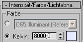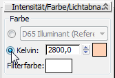- Wählen Sie im Rollout "Intensität/Farbe/Lichtabnahme" die Option "Kelvin" (Farbtemperatur), um die Lichtfarbe in einen weichen Gelbton (2800K) zu ändern.