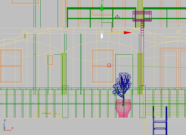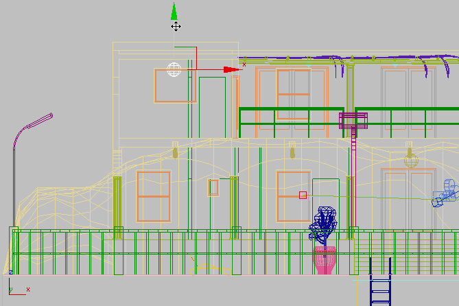 vergrößern Sie die Ansicht im Ansichtsfenster "Vorn", bis Sie die Verandalampen rechts von der Lichtquelle, die Sie gerade erstellt haben, sehen können.