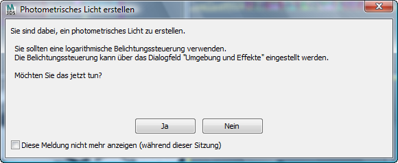 In 3ds Max wird ein Dialogfeld geöffnet, in dem Sie gefragt werden, ob Sie eine "mr - Fotografische Belichtungssteuerung" in der Szene hinzufügen möchten.