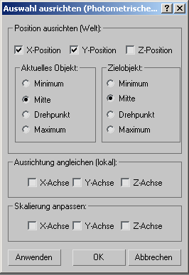 im Bereich "Auswahl ausrichten" (Bildschirm) die X-, Y- und Z-Position, und wählen Sie "Zentrieren" für das aktuelle Objekt und das Zielobjekt. Klicken Sie auf "OK".