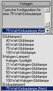 Modifikatorgruppe. Öffnen Sie im Rollout "Vorlagen" die Dropdown-Liste und wählen "100-Watt-Glühlampe".