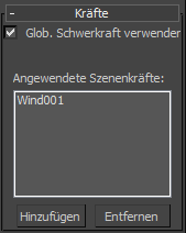 Rollout Kräfte auf Hinzufügen, und wählen Sie den Wind-Space-Warp aus. Der Name des Space Warps wird in der Liste Angewendete Szenenkräfte angezeigt.
