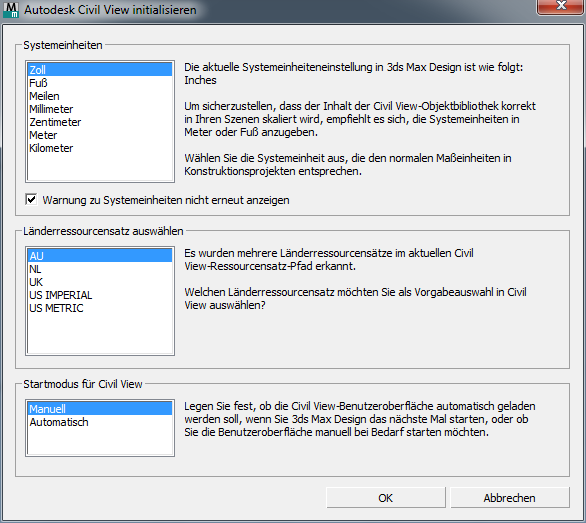 Nachdem Sie "Initialisieren" ausgewählt haben, zeigt 3ds Max Design das Dialogfeld "Autodesk Civil View initialisieren".