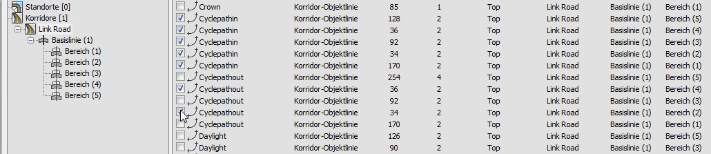 Das Fenster auf der linken Seite zeigt die Hierarchie der ursprünglichen Szene, und das Fenster auf der rechten Seite zeigt einzelne Linien- und Flächenobjekte.