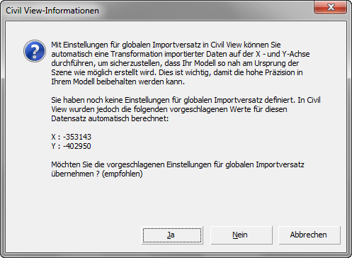 Wenn ziviltechnische Daten basierend auf Vermessungsdaten importiert werden, können die Koordinaten sehr groß und vom Ursprung (0,0) versetzt sein. Das Laden der Daten ohne Verschieben des Ursprungs kann zu unerwartetem Verhalten des Ansichtsfensters führen, insbesondere aber zur ungenauen Modellierung aufgrund von Rundungsfehlern. Um diese Fehler zu vermeiden, verwenden Sie immer "Globaler Importversatz".