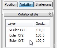 Rollout "PRS-Parameter" die Schaltfläche "Drehung" aktiviert ist. Kontrollieren Sie dann, ob im Rollout "Rotationsliste" ein neuer Unter-Controller zur Rotationsliste hinzugefügt wurde (insgesamt sollten 3 vorhanden sein).