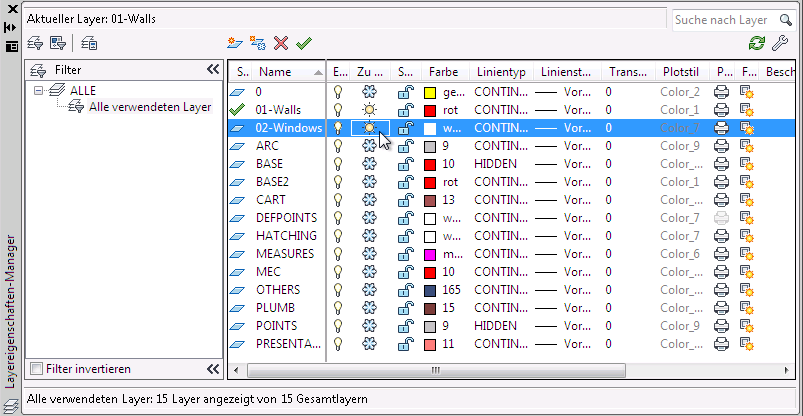 (Layereigenschaften). AutoCAD öffnet das Dialogfeld "Layereigenschaften-Manager".