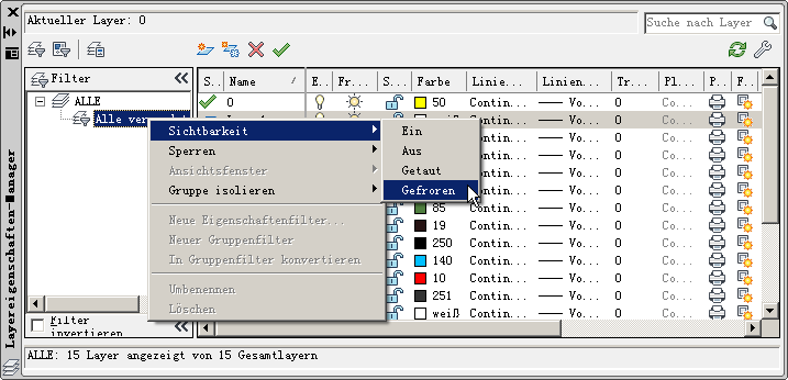 - Klicken Sie im linken Fensterbereich mit der rechten Maustaste auf "Alle verwendeten Layer" und wählen dann "Sichtbarkeit"