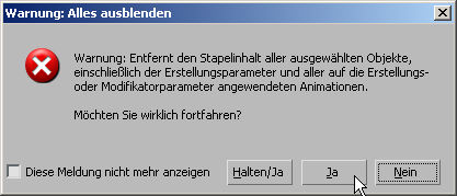 3ds Max zeigt eine Warnmeldung zur Ausblendung des Stapels. Klicken Sie auf Ja.