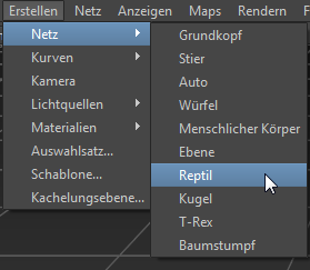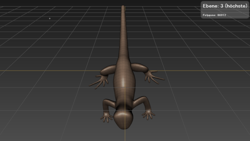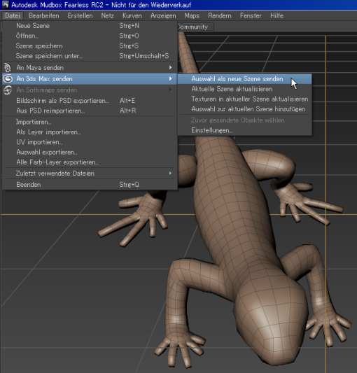 Mudbox startet 3ds Max. Nach einer Pause wird das Echsenmodell in Ansichtsfenstern angezeigt. Es ist bereits ausgewählt.