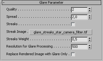 Ermöglicht das Festlegen eines Kompromisses zwischen Detail und Geschwindigkeit. Eine niedrigere Qualitätseinstellung führt zu einer schnelleren Blendung. Sie kann jedoch zu einem schachtelförmig wirkenden Lichthof führen. Ein höherer Qualitätswert führt hingegen zu einem insgesamt besseren Effekt, der jedoch eine längere Renderingzeit beansprucht. Für die meisten Szenen eignet sich ein mittlerer Wert.