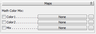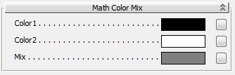 Mit den Steuerelementen in diesem Rollout können Sie einem der Grundparameter des Shaders "Math Color Mix" einen Shader zuweisen. Dies ist vergleichbar mit der Verwendung eines Maps einer Standardmaterialkomponente; durch Hinzufügen von Shadern können Sie eine Shaderstruktur erstellen, die komplexe Effekte generiert.